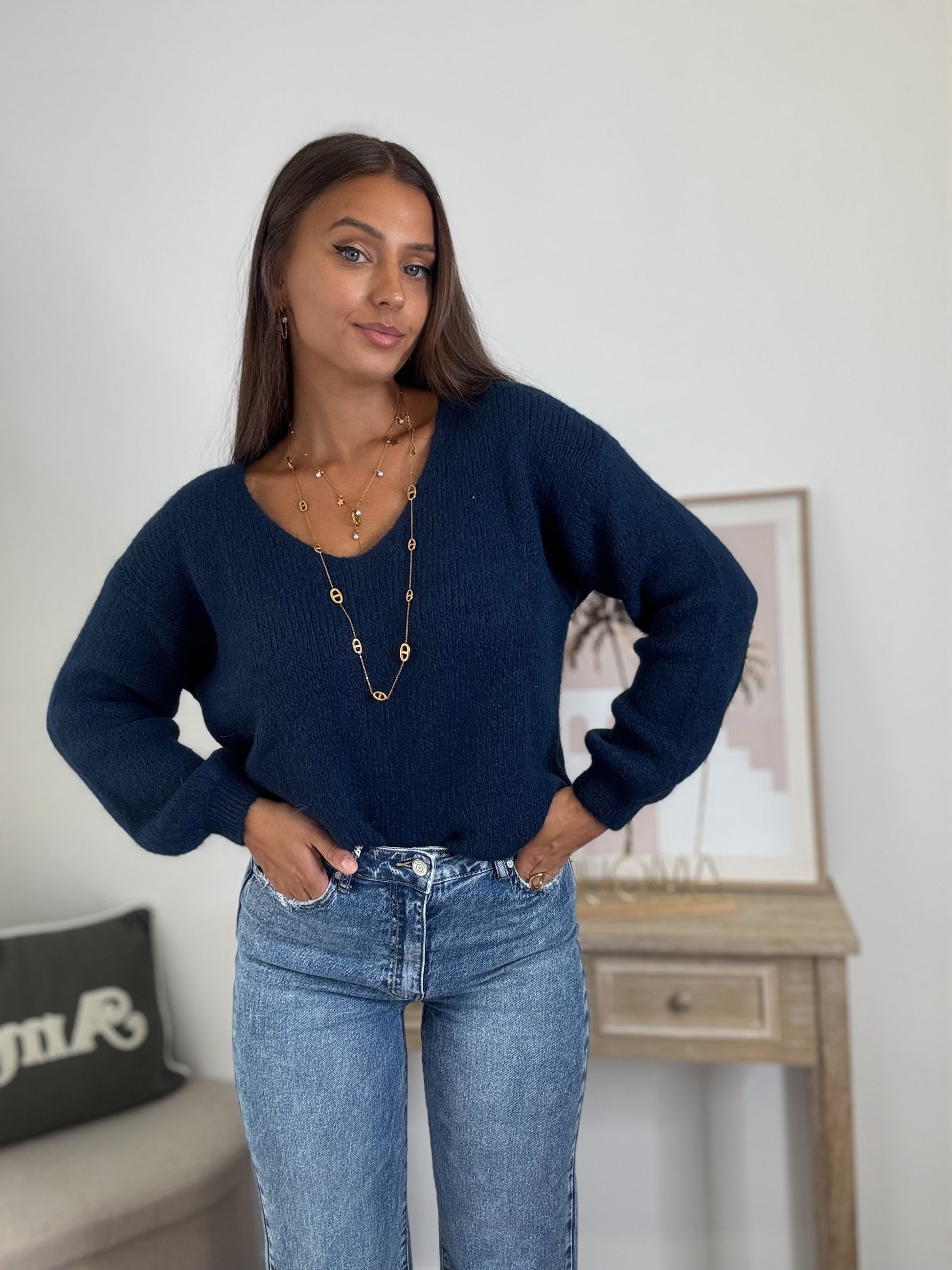 Apportez de la couleur et de la douceur à vos looks avec ce pull bleu marine. Sa maille confortable et son col en V flatteur en font une pièce indispensable pour un style à la fois chic et décontracté. Facile à associer, il se porte aussi bien avec un jean qu’avec une jupe élégante.